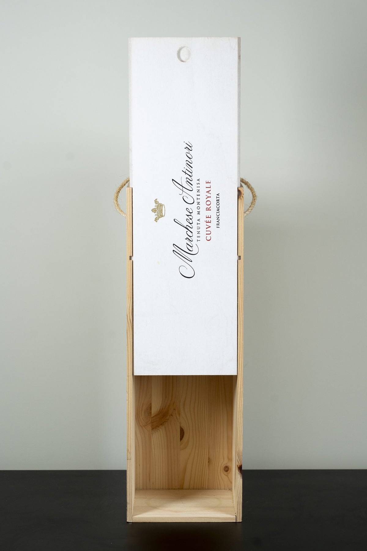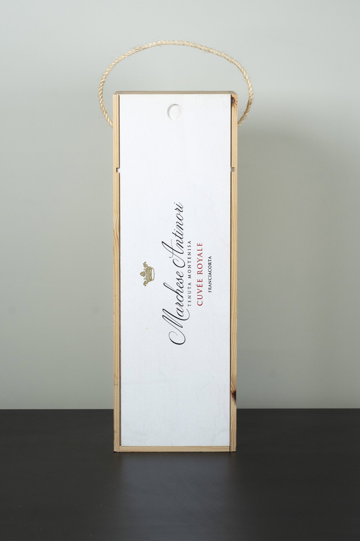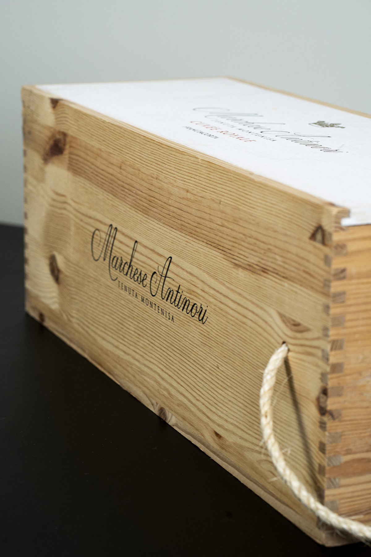 Per una delle cantine più iconiche al mondo – la storica famiglia Antinori, attiva dal 1385 e leader dell’innovazione vinicola – abbiamo realizzato una cassetta in pino massello naturale con coperchio colorato ad acqua, stampato serigrafato in tre tinte e rifinito con manico in corda